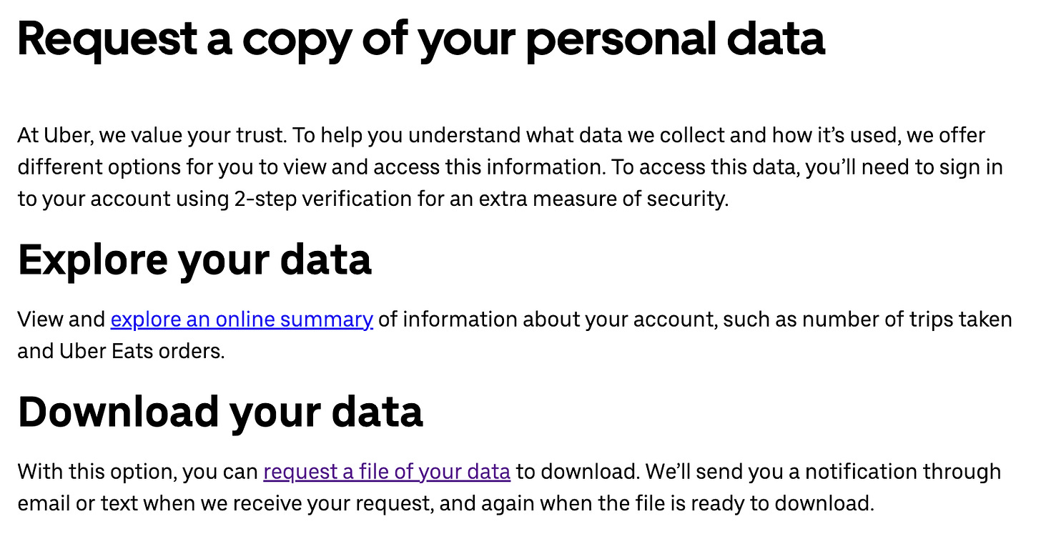 A fun fact about a lot of platforms is, if you have an account with them, it’s likely that you can download your data to get a sample of your records with the company. With a sign in to your Uber account, you can request an archive of your Uber data, including Rides and Eats.