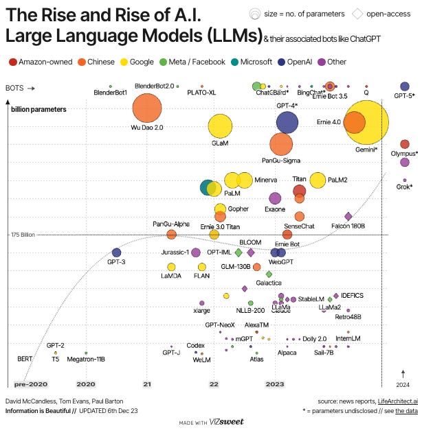 Taking a glance at the visual below, we saw an incredible growth in the size of large language models. GPT-4 has an estimated 1T+ parameters. Amazon’s LLM that has yet to be released, Olympus, is expected to have 2T parameters. Google’s Gemini has an unclear number of parameters, but is expected to be large and outperform GPT-4, perhaps by a lot.