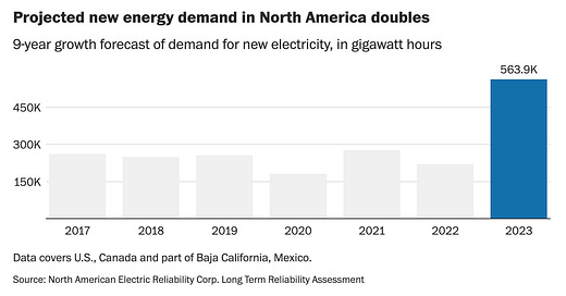 In 2023, projected new energy demand skyrocketed, nearly tripling the 2022 forecast. I was at a dinner with some investors a few weeks ago and shared this tidbit. I was met with a response so dramatic I had to fact check myself to make sure I was remembering correctly.