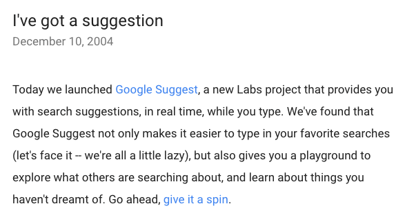 The name didn’t stick but the project sure did. In 2004, Google Suggest was launched.