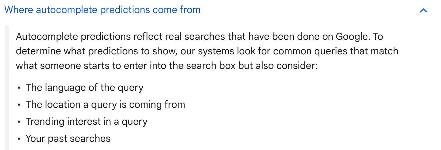 Google’s autocomplete predictions today “reflect real searches that have been done on Google”. Considering features such as “the language of the query, the location a query is coming from, trending interest in a query”, and the user’s past searches, Google suggests the top recommendations to complete your query and populate your search bar.