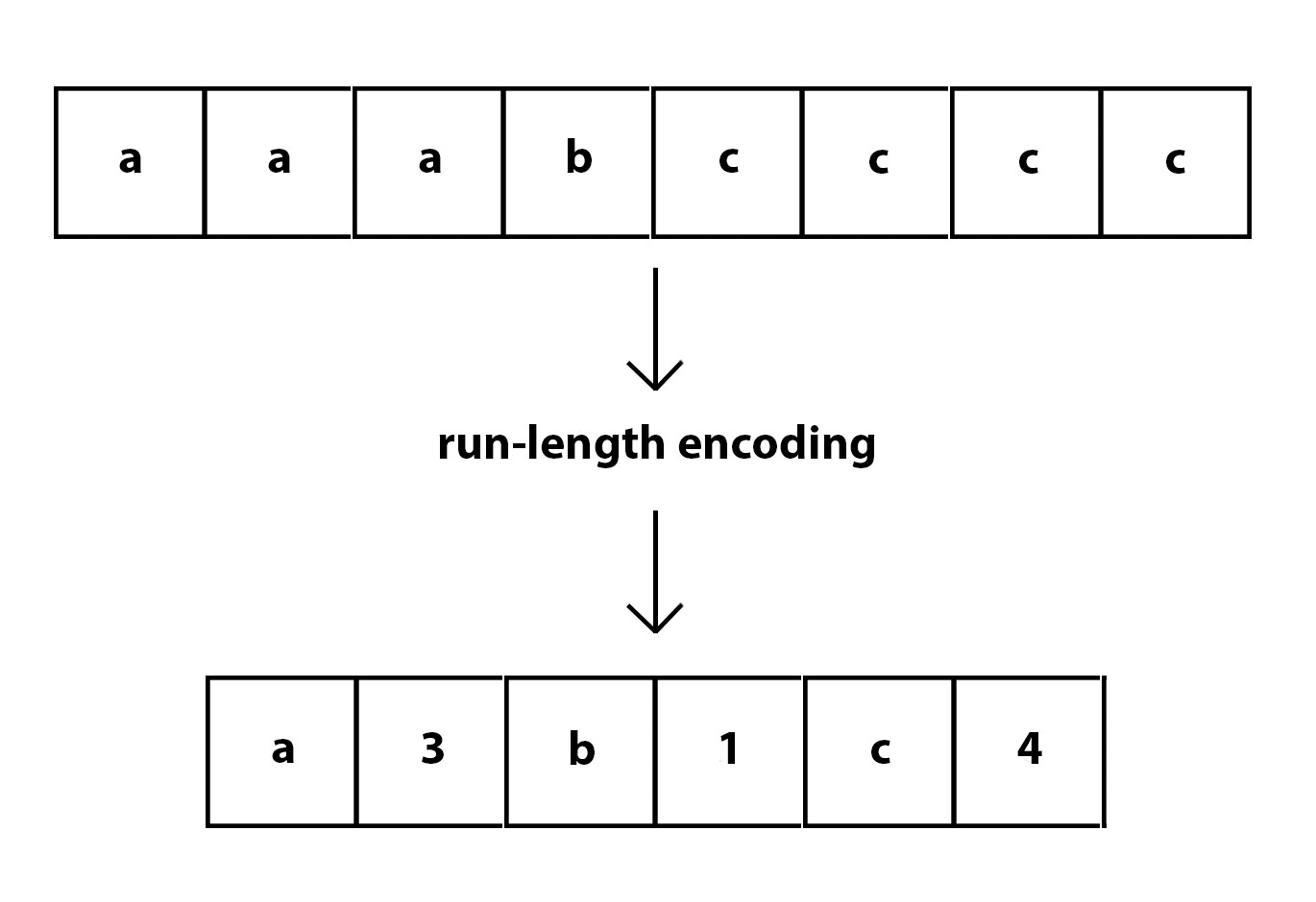 Run-length encoding is a lossless compression algorithm first patented in 1983. It’s a simple method that can help explain a basic approach to compression. The first sequence below could represent a line of pixels in an image. Imagine each letter represents a color block. With run-length encoding, we can compress an 8-block sequence into a 6-block representation. In the compressed version, one block represents the color, then the next block represents how many times in a row that block appears. Run-length works better for data with repeated values, which isn’t always the case in images.