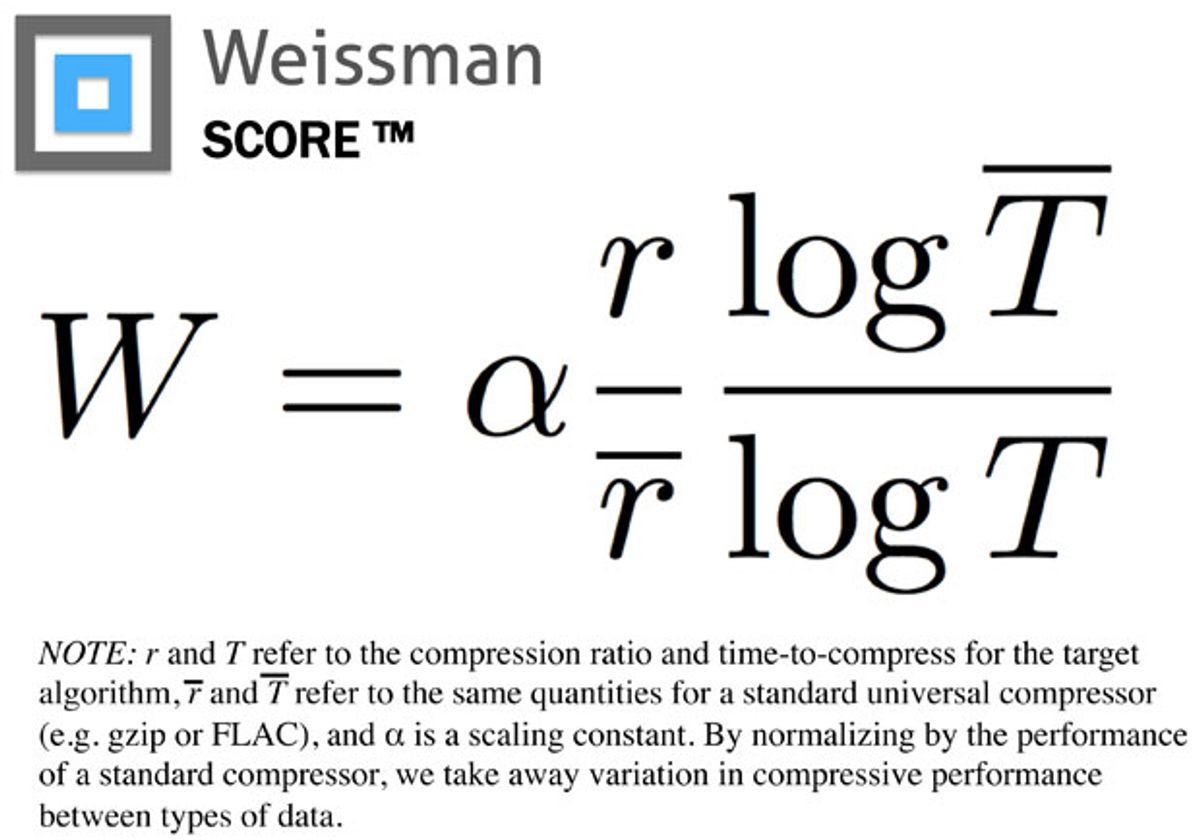 Enter the Weissman Score — it combines the compression ratio, the ratio of the log of compression time, normalized against an industry standard compressor. The score was perfect for producers to communicate to a non-technical audience which company had built a better algorithm. It translated well to television and made for an epic scene.