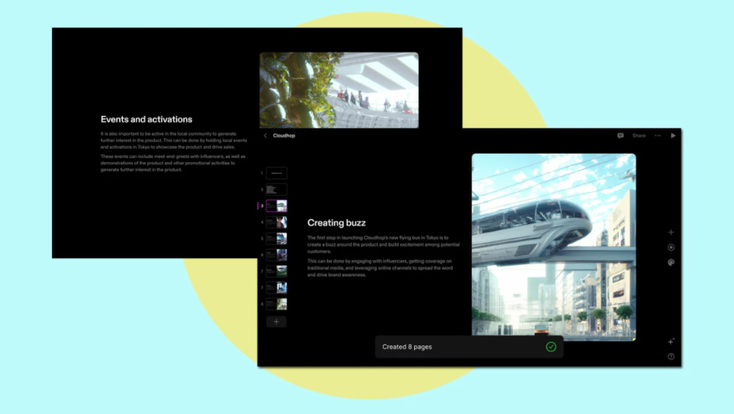 Tome is carving out a new space for generative storytelling, allowing users to give a prompt, a company/product description or more and get a full pitch deck or other story spilled out in deck form in no time.