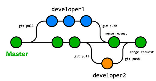 As you can see, developer2 is also making changes at the same time. Since the remote version of the code base is shared, that’s totally ok. developer2 can pull the latest version of master, make some edits on their local computer, then create another merge request to get approval from their collaborators on their new edits.