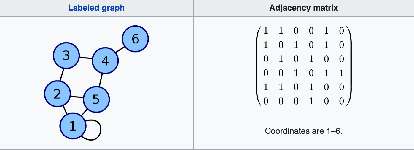 An adjacency matrix is a mathematical representation of a graph. In its simplest form, a 1 represents an edge existing between two nodes, while a 0 represents no edge between the two nodes. As shown in the image below, an edge can even exist between a node and itself!