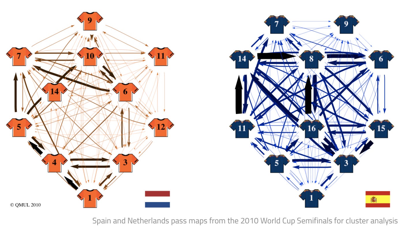 Inspired by the recent World Cup, here’s an example of a graph that shows soccer players (one player is one node) and their pass maps (every edge represents a pass made, with thicker edges meaning more frequent passes):