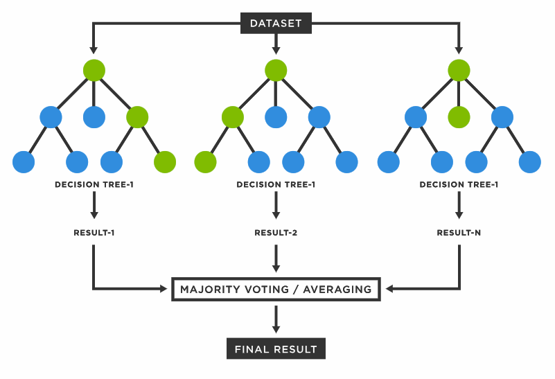 Random forests utilize multiple decision trees to get to a single result. It can handle regression and classification, while providing better accuracy and flexibility. Random forests came after the bagging technique was established in 1996 by Leo Breiman. Bagging is a method where you can select a sample of data points from a dataset with replacement (meaning one data point can be chosen multiple times) and build several models. The average or majority of predictions from each model get you to a more accurate prediction than one decision tree model alone. Bagging can use other types of models, not just decision trees. Random forests, however, are an extension of the bagging technique with decision trees, with elements of randomness! Instead of using all the features in a model, random forests select subsets of features at random to ensure no dependence on a single variable is too strong, resulting in poor model performance. We could talk for a while about the intricacies of random forests, but instead, here’s a good article if you want to get into the details.