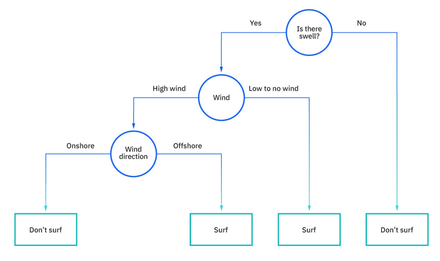Decision trees also have roots in human behavior. While the exact history of the decision tree is quite ambiguous, decision trees are something humans do at an incredibly fast speed, hundreds if not thousand of times a day. Before I want to go surfing, the chart below is a pretty good representation of the inner monologue I’ll conduct to result at a decision of “surf” or “don’t surf”. The technical process of decision trees mirror much of this inner dialogue.