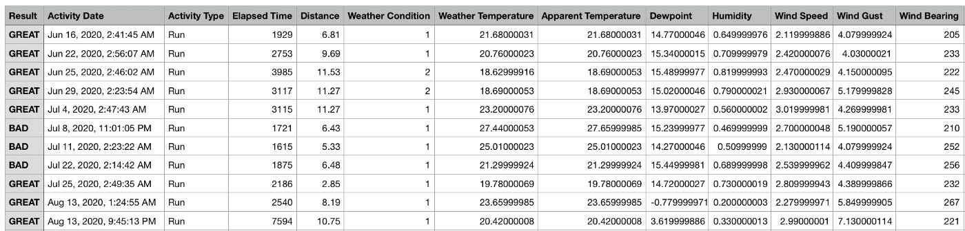 My memory is only so good, so I wasn’t able to perfectly tag all old runs as great or bad. I would like to fix this by keeping track of weather in my Strava descriptions from here on out and updating my training data in the next few months.