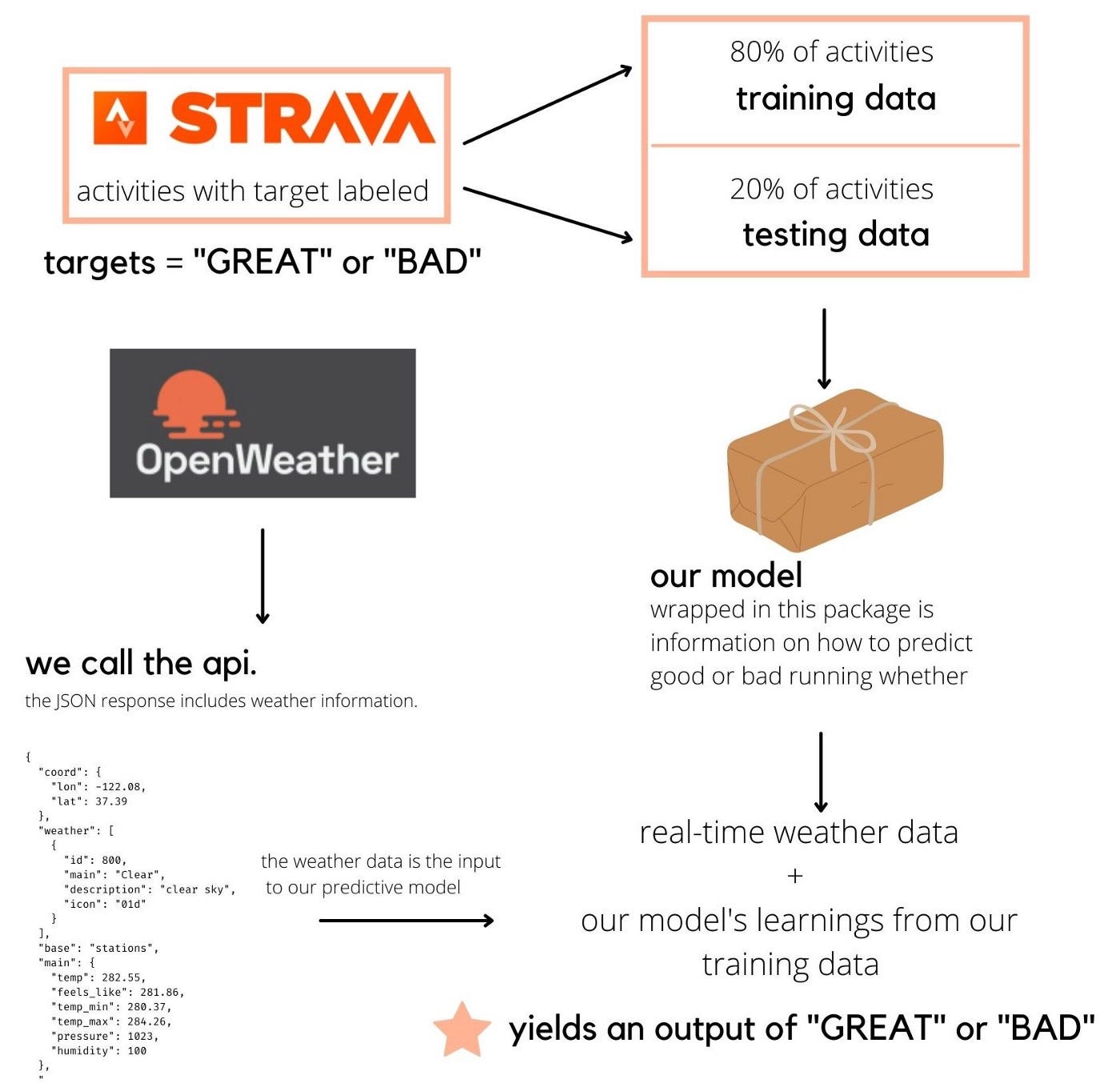 How does this model work? Our labeled Strava dataset will act as our training data. Our model will look at this data and extrapolate information on how the weather inputs impacted my “good” or “bad” tagging. It will use what it learns and be able to apply the findings to new weather data on the fly. We will get real-time city-specific weather data from OpenWeather’s API and alert the user whether it is “good” or “bad” running weather.