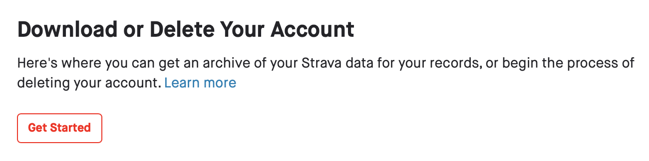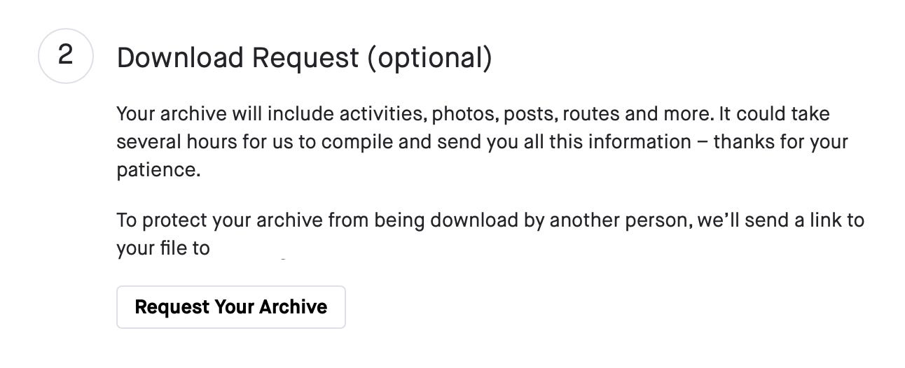 The first step of our data gathering is to download an archive of our Strava runs. WARNING: the prompts that you must click before getting to the archive button mention downloading or deleting your account. You won’t delete your account when you request this data. While it’s not my favorite choice on Strava’s user experience side, it is the easiest avenue to get the data we need.