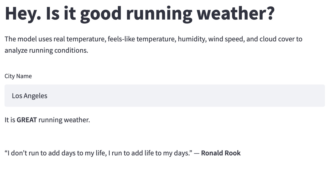 Now we have our model and can predict for cities on the fly whether there will be good or bad running weather. But how can a user interact with this information?
