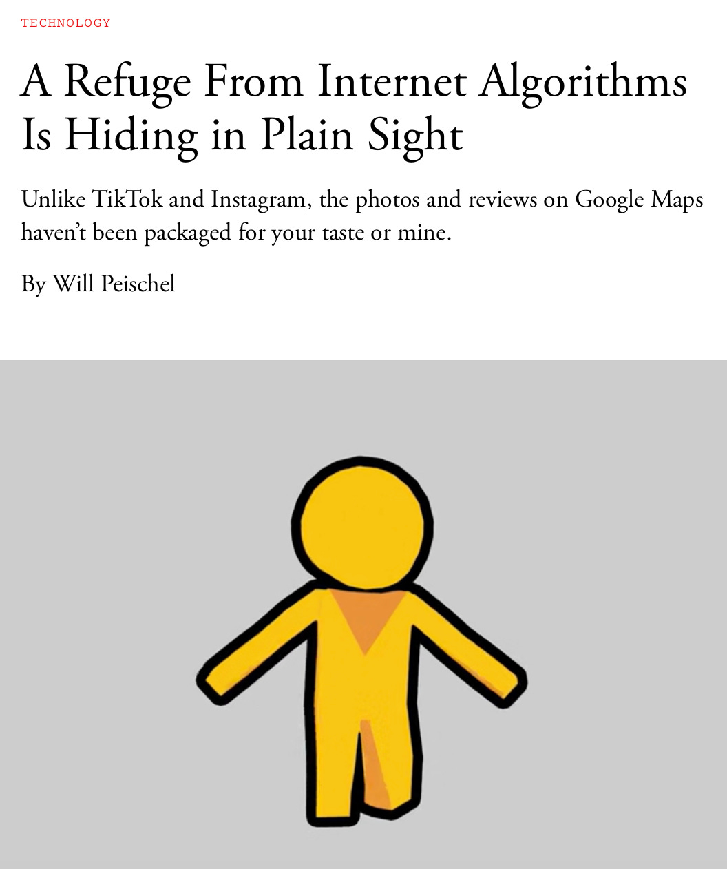 Will Peischel’s piece on Google Maps as a “refuge” from the inundation of internet algorithms we have in our world is a fun and insightful read on the diminishing parts of the internet that aren’t overrun by influencers and taste-driven profiles.