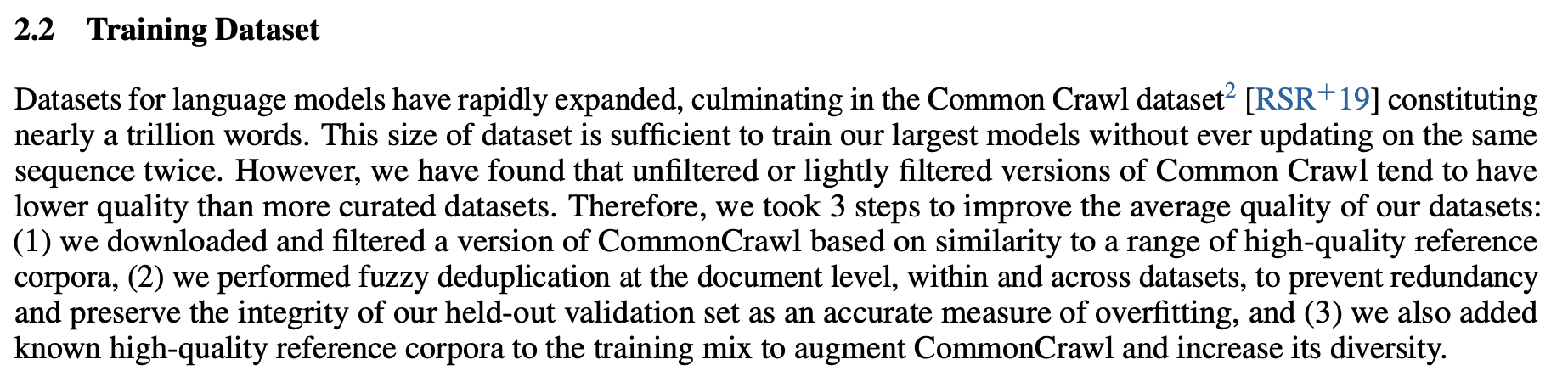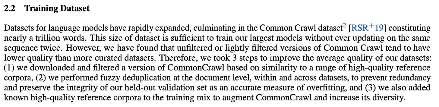 Common Crawl remains one of the best standardized datasets for large language models. The dataset is rich in human generated text and diverse in its representation of the breadth of the internet. However, there are downsides to Common Crawl — it is not in real time, the HTML format makes it heavy on the preprocessing, and there are still prevalent biases to English speaking, younger web users that drive much of the content on the internet. Some incredible AI ethics researchers, including ousted from Google’s Timnit Gebru, have posed questions on the use of a dataset such as Common Crawl in LLM’s.