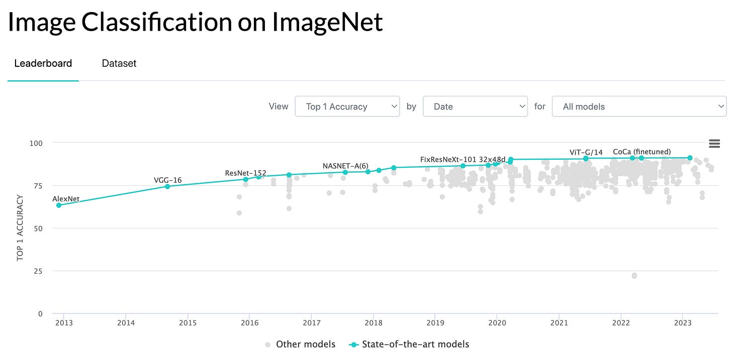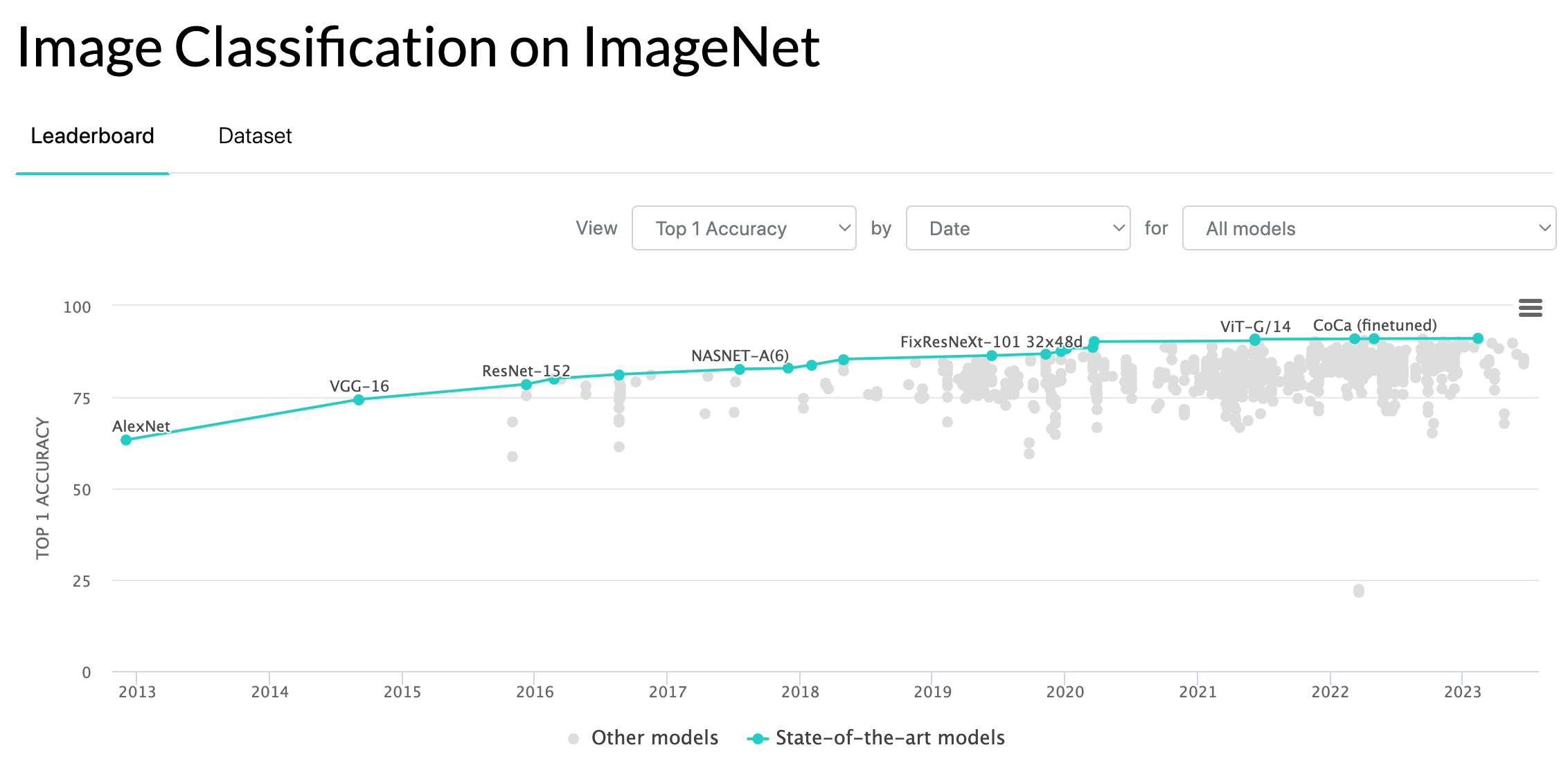 PapersWithCode is a great resource for better understanding how machine learning approaches “state of the art”. Given a machine learning task, let’s say image classification, they share associated standard datasets and the metrics achieved by various models. Shown below, you can see each data point is a model developed by researchers that tackles image classification using a given dataset, called ImageNet, and measuring a selected metric, here accuracy. The graph shows that since 2013, lots of models have been proposed, pushing the definition of “state of the art” performance measured by accuracy of the model. Common datasets, such as ImageNet, allow for the ability to see how the field is growing and models are improving, while increasing transparency for users of these models.