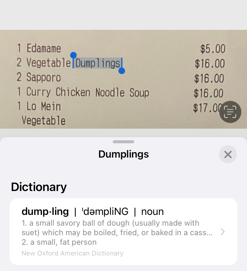 Here’s an example: splitting the bill for a dinner last week means I’ve got photos the receipt making sure to get the Venmo’s after (paying so I get the airline miles, you know the drill). Looking at the receipt, I can merely press down on any text in the receipt and grab the text from it, making it easy to look up a term, or copy it into a text to a friend letting them know just how much to pay for the ‘dumplings’.